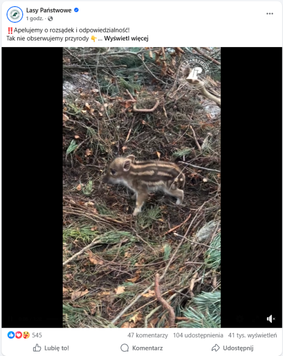 Na profilu Lasów Państwowych na Facebooku zamieściliśmy post z nagraniem przesłanym przez jednego z naszych obserwatorów. Jest to przykład negatywnego postępowania przy spotkaniu z dzikim zwierzęciem, w tym przypadku z młodym dzikiem.
